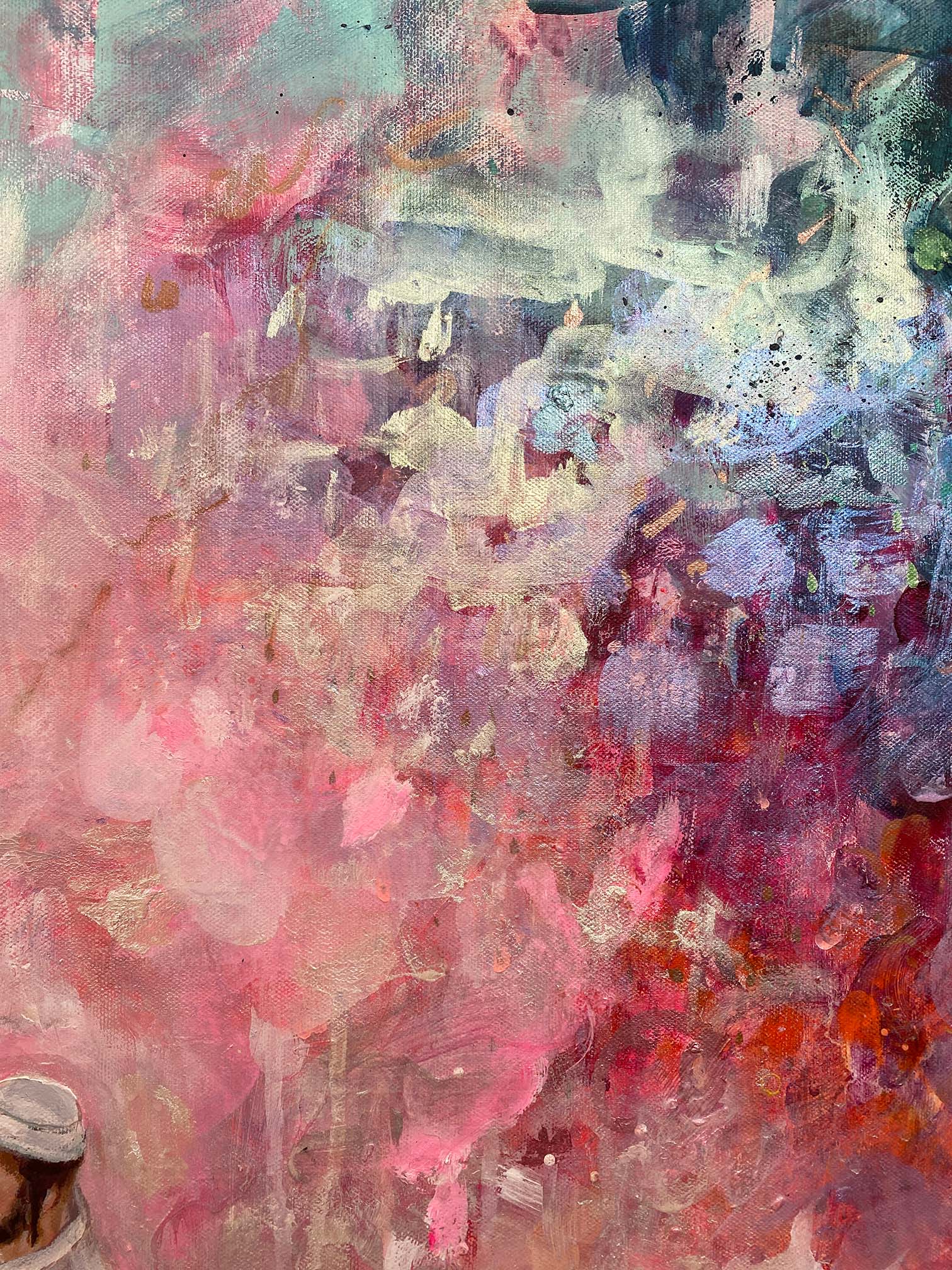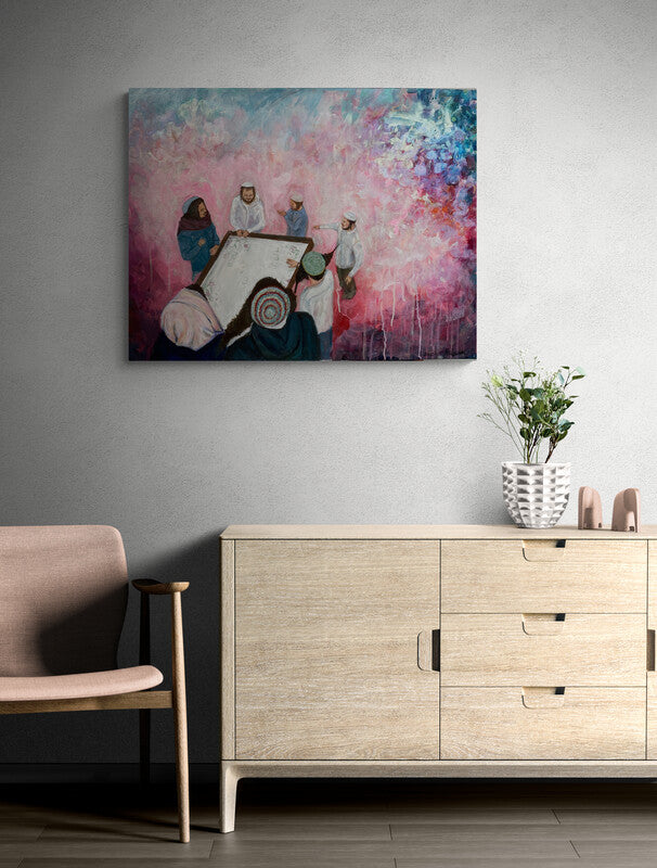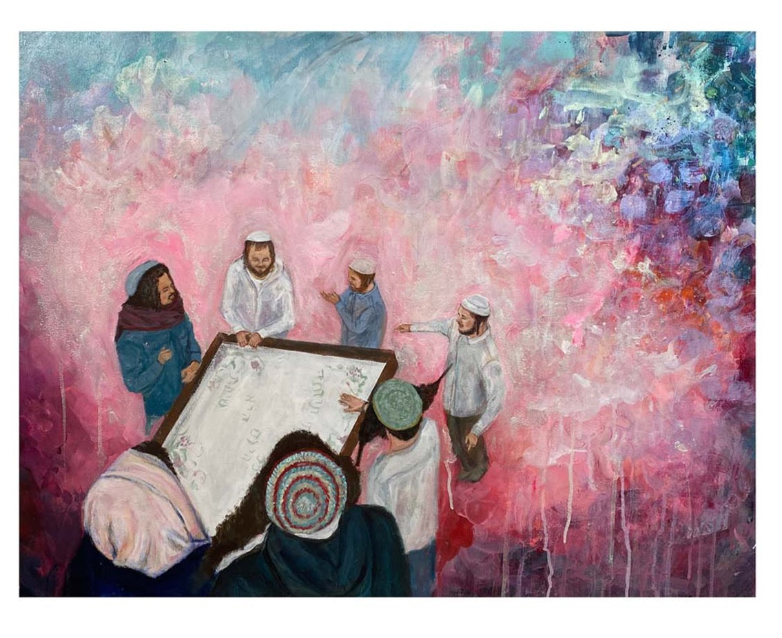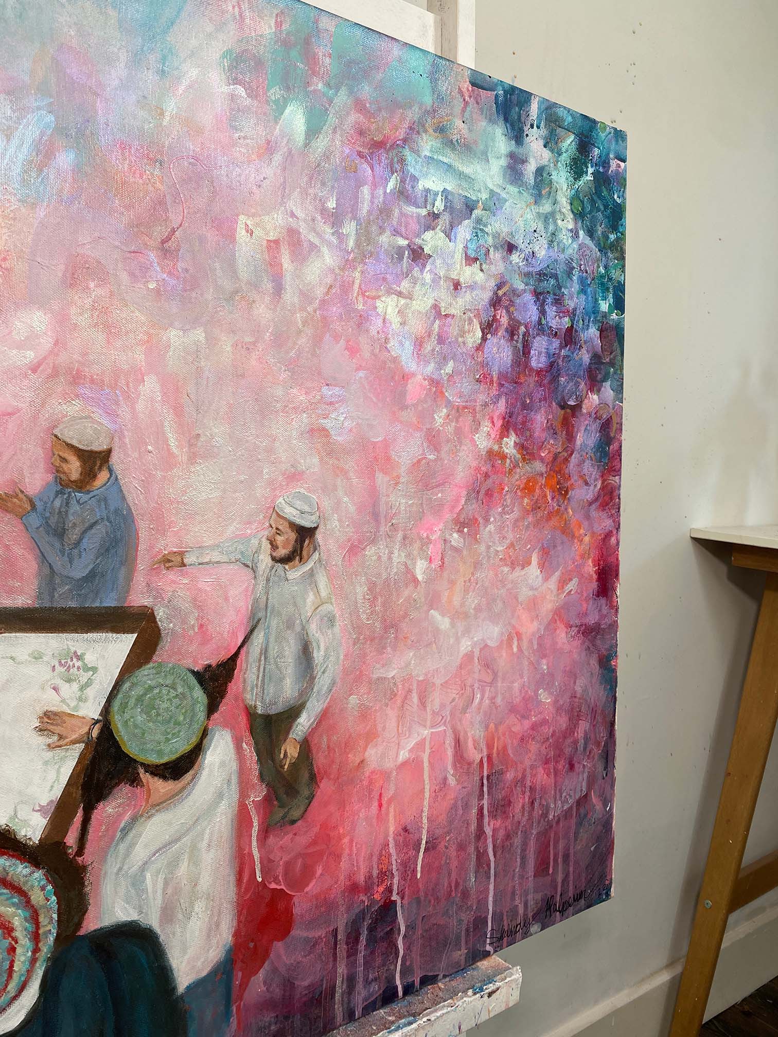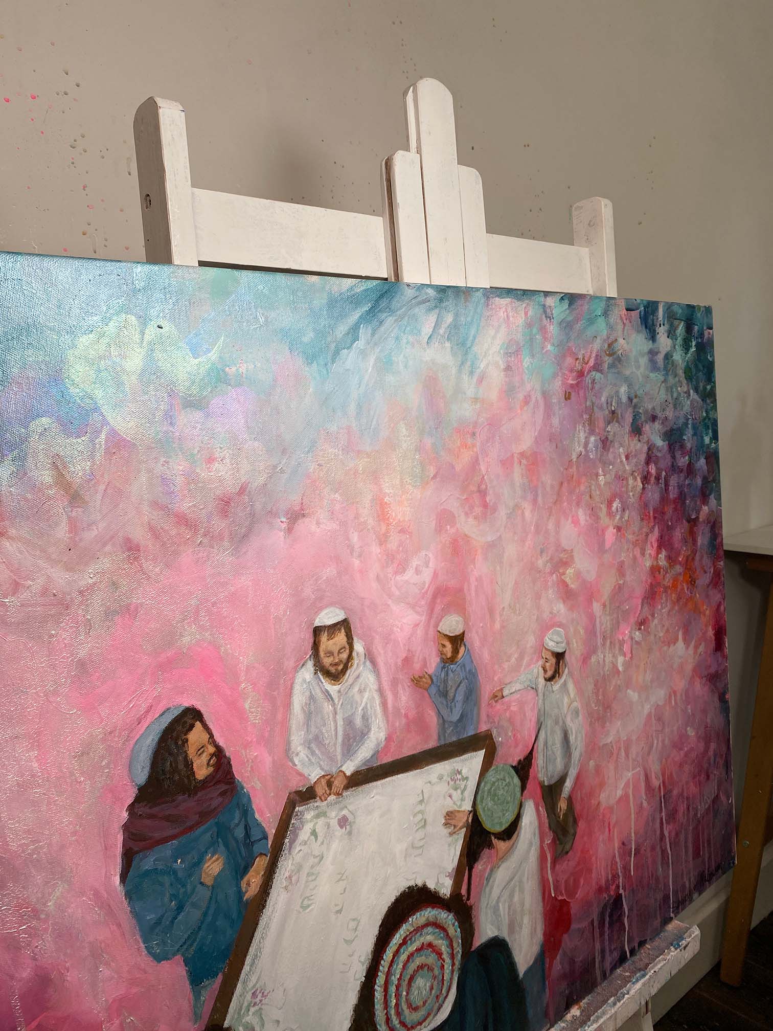 This painting is captures a moment of true joy. On the holiday of purim the streets of Tzfat is buzzing and the festive energy can be felt in the air. This piece is painted in vibrant shades of rosy pink, sky blue and hints of lavender, creating a tasteful rainbow. The splashes of iridescent paint really makes it come alive. Just looking at this painting will leave you feeling uplifted and inspired.