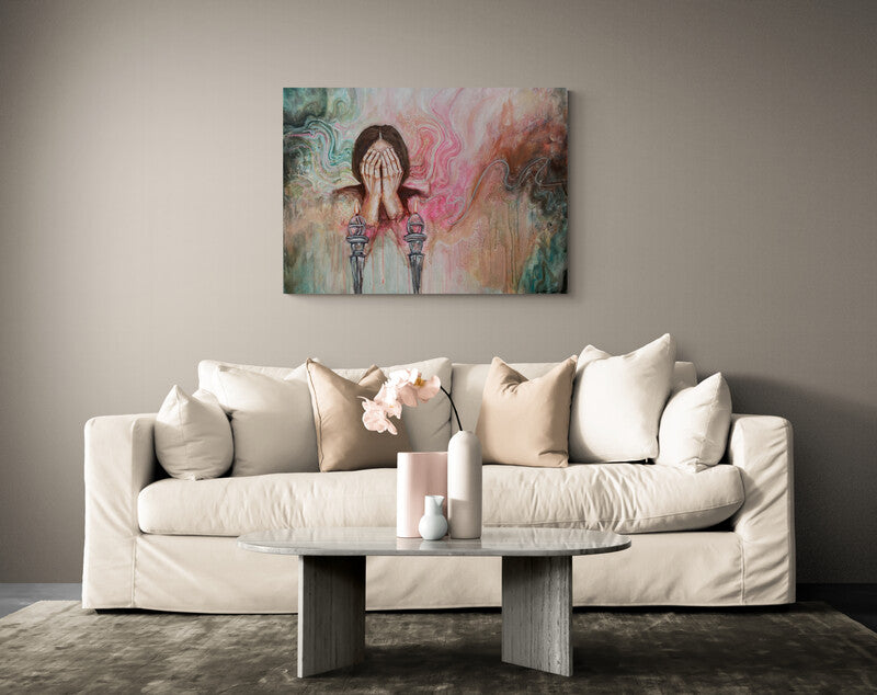 “transcendence” is a dreamy painting filled with lively colors and expressive marks. The use of vibrant pinks, muted greens and nuetrals create a dynamic but balanced relationship between complementary colors. This statement piece will add a tasteful pop of color to your space.